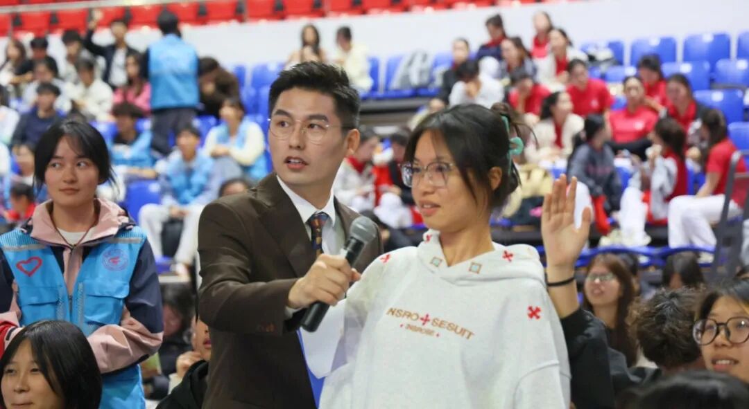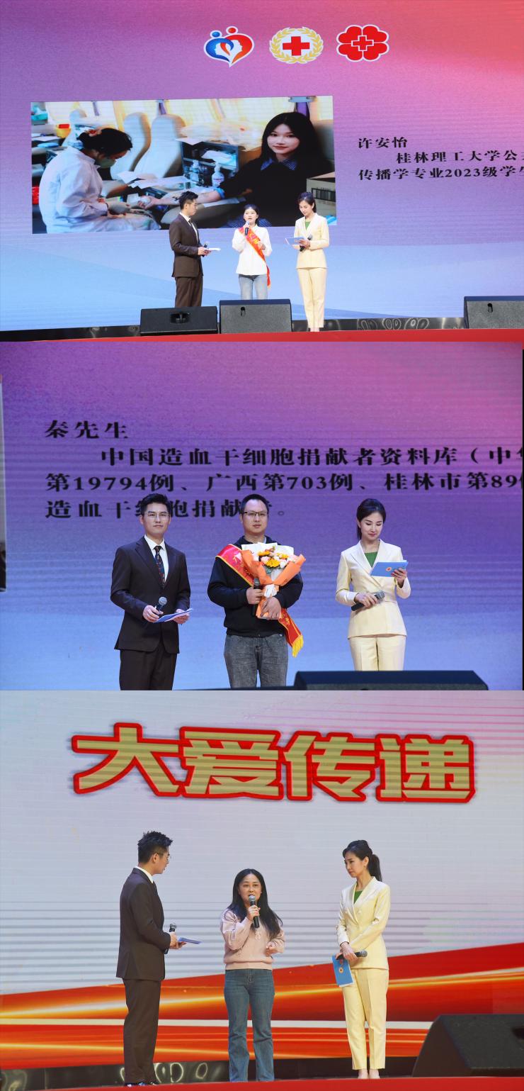 11月13日,“健康广西你我共建 无偿献血爱心同行”2025年广西“三献”主题宣传活动在雁山校区新体育馆举行。中国造血干细胞捐献者资料库广西管理中心(广西壮族自治区人体器官捐献管理中心)主任黄吉宁、学校团委书记潘思伊、广西壮族自治区血液中心副主任韦军、桂林市红十字会党组书记、专职副会长唐小荣等嘉宾出席会议,“三献”志愿者及学生代表等600余人共同参与。活动由中华骨髓库广西分库爱心大使、广西广播电视台综艺旅游频道主持人李嘉、王千主持。