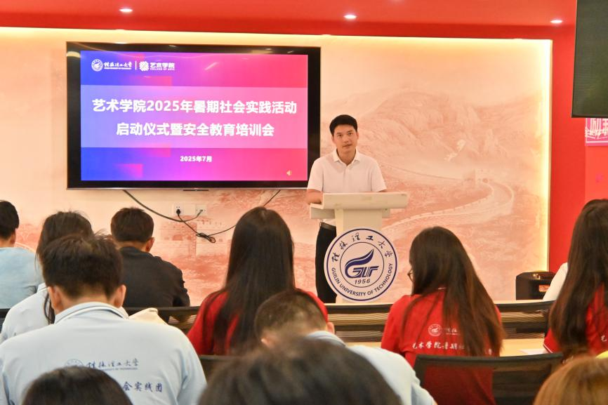 为深入学习贯彻习近平新时代中国特色社会主义思想,全面贯彻落实党的二十大和二十届二中、三中全会精神,教育引导广大青年学子在社会实践中受教育、长才干、作贡献,7月4日,艺术学院在雁山校区“一站式”学生社区明园思政大讲堂开展2025年暑期社会实践活动启动仪式暨安全教育培训会。艺术学院党委副书记、纪委书记黄传伟,社会实践团队指导老师唐源江、梁璇、周俊巧、李春来以及社会实践团队全体成员40余人参加本次活动。