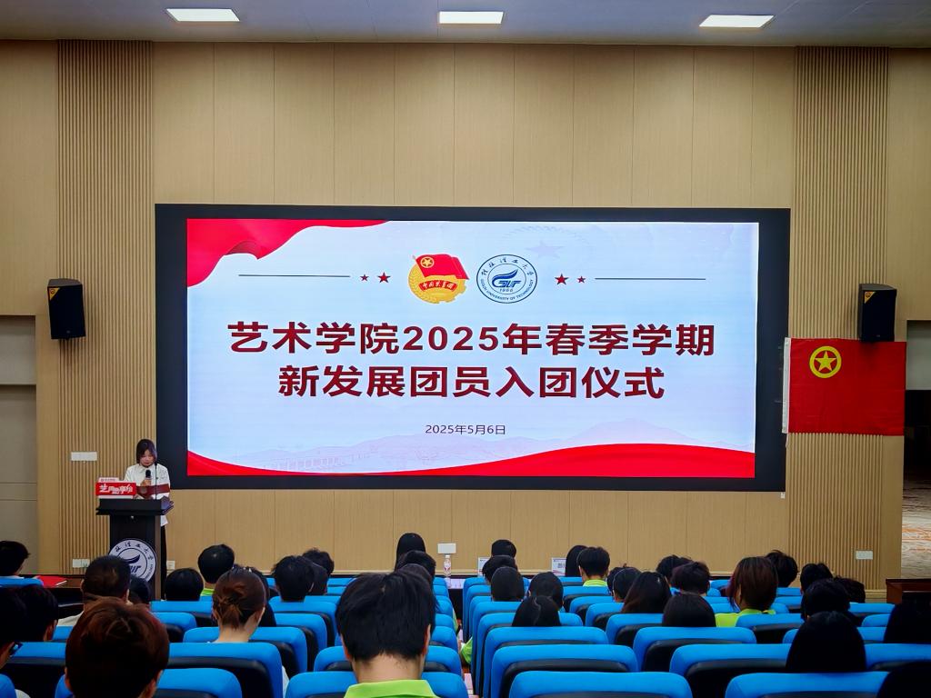 为传承和弘扬五四精神,引导广大团员青年听党话、跟党走,5月6日,艺术学院在博雅讲堂举行2025年春季学期新发展团员入团仪式。学院党委副书记黄传伟、团委副书记(主持工作)梁璇、团委副书记(兼)邵欣悦、2025年春季学期新发展团员、各基层团支部书记及2024级全体团员等180余人参加仪式。
