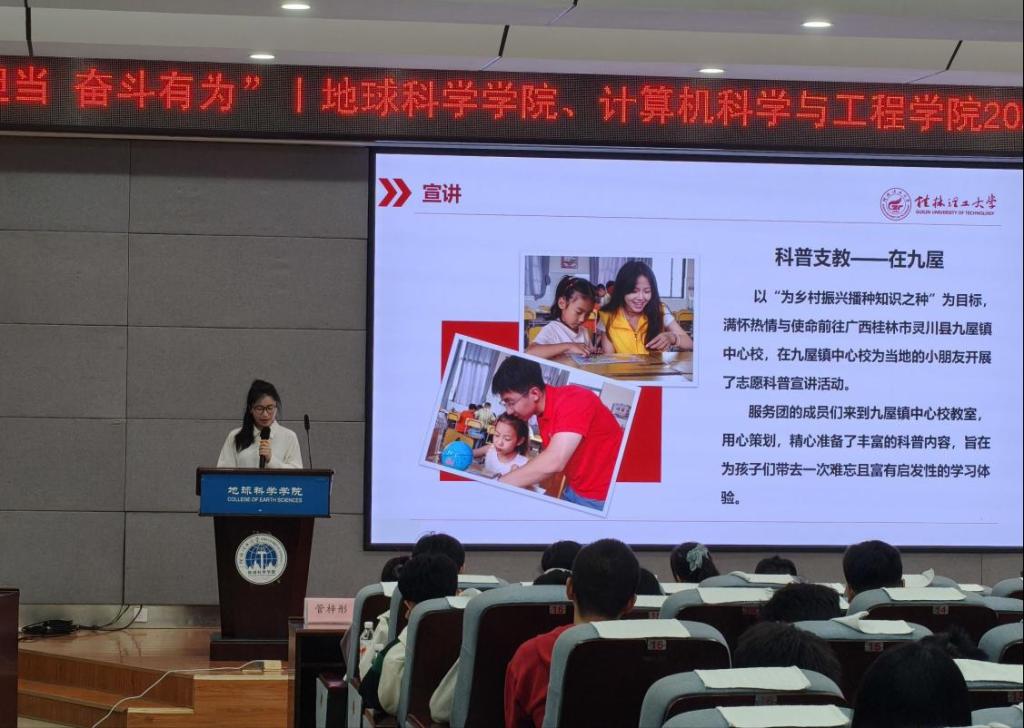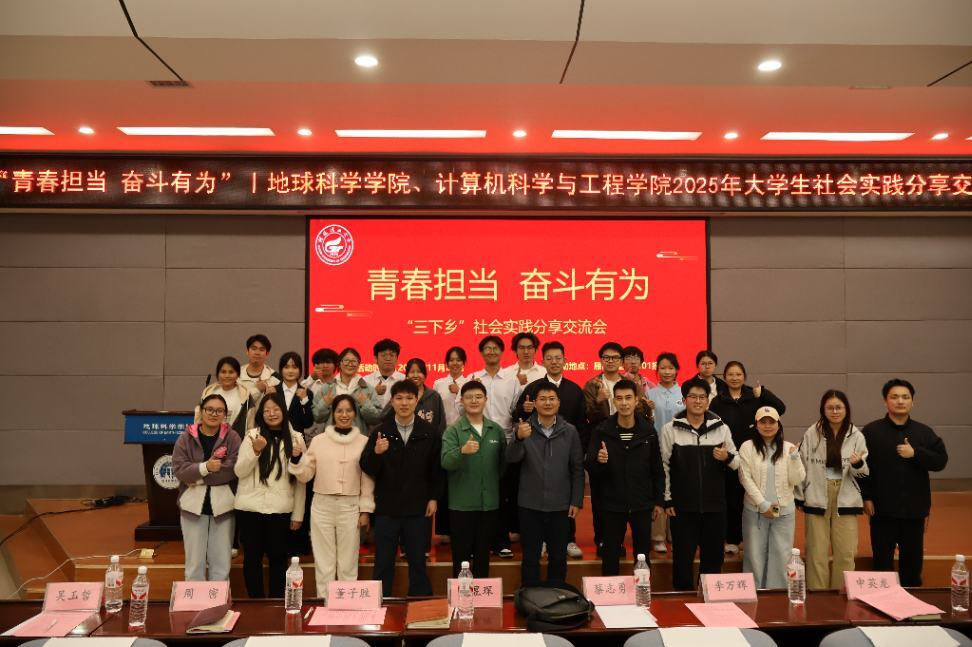 为系统总结大学生社会实践工作,深化活动影响,推动引领示范,提升育人实效,2025年11月25日晚,计算机科学与工程学院、地球科学学院在01501报告厅联合举办“青春担当,奋斗有为”2025年大学生社会实践分享交流会。计算机科学与工程学院团委副书记蔡志勇,地球科学学院团委副书记王昱琛、辅导员周密,材料科学与工程学院辅导员董子胜,各学院的兼职辅导员与社会实践团队成员共同参会。